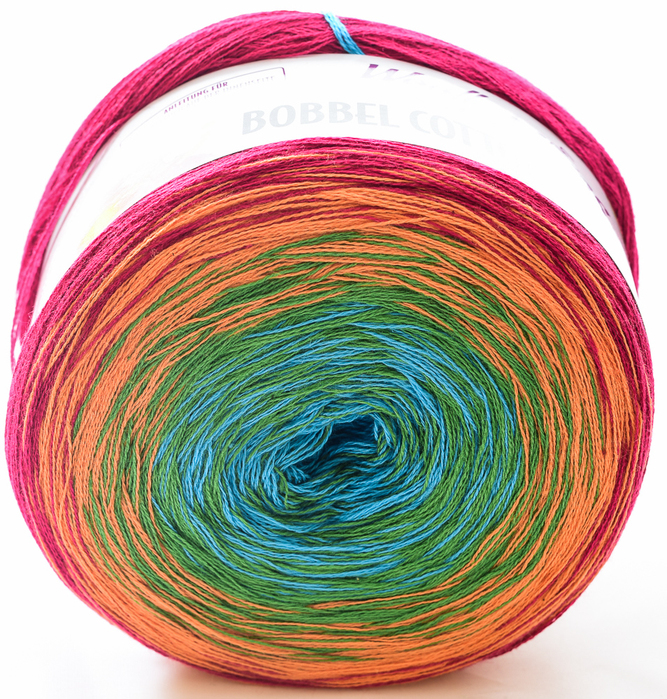 Die Bobbel sind 4-fädig gefachtes Garn aus Baumwolle und Polyacryl. Dabei werden perfekt passende Farben gleichmäßig zu einem Verlauf verarbeitet. Ihr strickt also mit einem einzigen Faden wahlweise von innen oder außen beginnend einen wunderbaren Farbverlauf. Das ist einfach, macht richtig Spaß und bietet sich für viele kreative Ideen und Accessoires an.