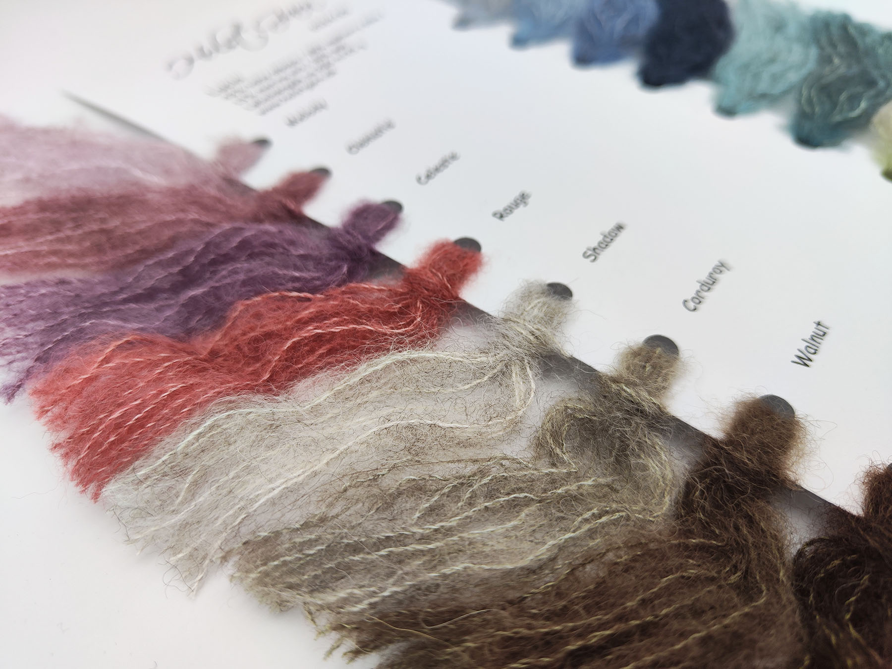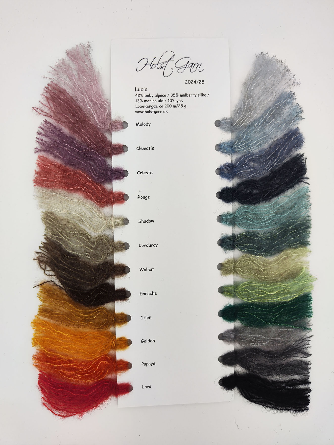 Die Farbkarte enthält Farbmuster für alle 24 Farben der aktuellen Holst-Garn Lucia-Kollektion.