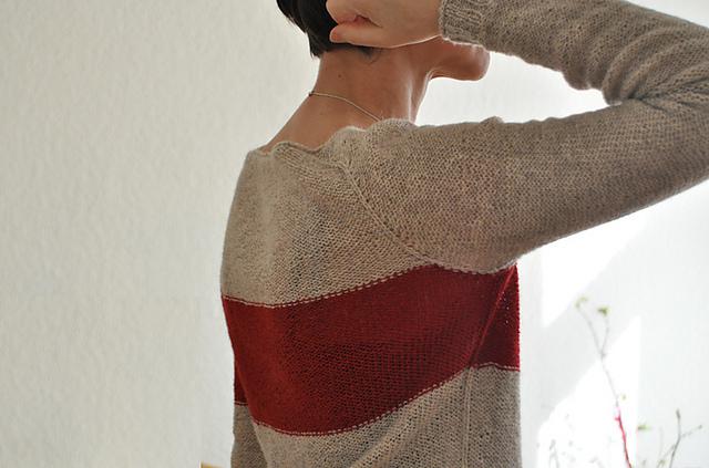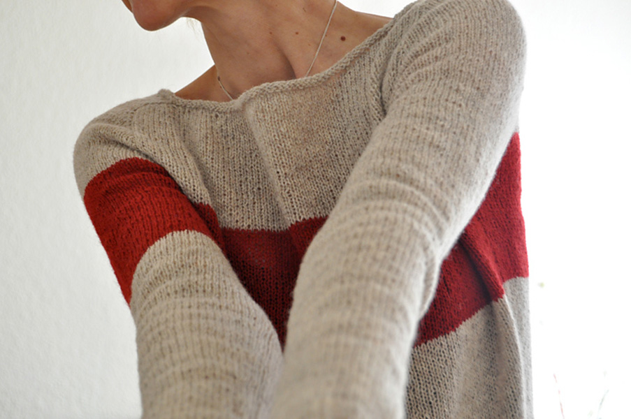 Der Pullover wird auf Links gedreht getragen um die schöne Stricktechnik hervorzuheben, kann aber genauso auch auf Rechts getragen werden. Gestrickt wird nahtlos von oben nach unten in Runden.