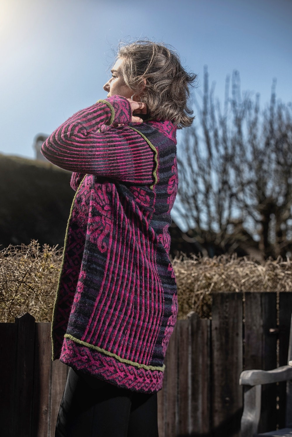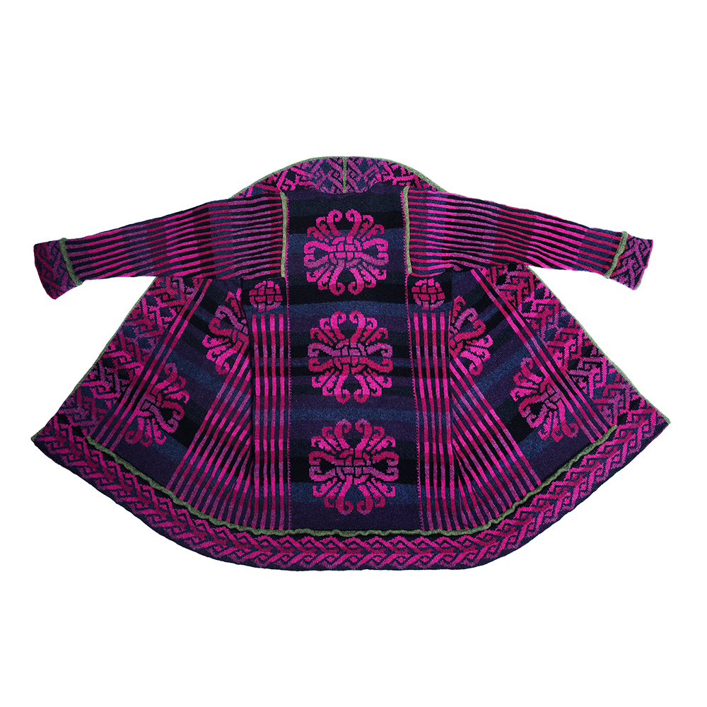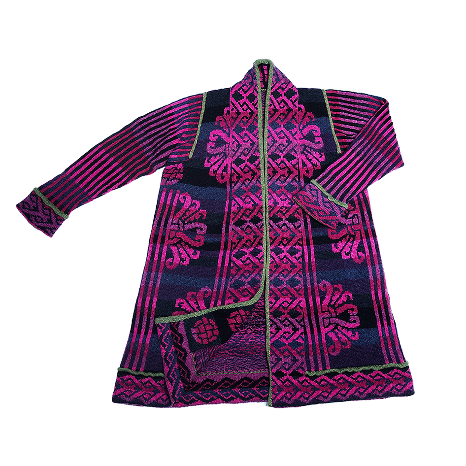 Mögen Sie ein Strickzeug, das Sie herausfordert? Dann ist dieser fantastische Mantel genau das Richtige für Sie. Der türkische Mantel ist die genaue Kopie eines original türkischen Mantels,der ursprünglich aus Stoff genäht und somit nicht gestrickt war. Mein Mantel ist auf Rundnadeln gestrickt und wird anschließend aufgeschnitten. Er besteht aus verschiedenen Teilen mit verschiedenen Mustern. Dieses Modell ist die neue Farbzusammenstellung aus pink, grün- und dunkelblau-Tönen.