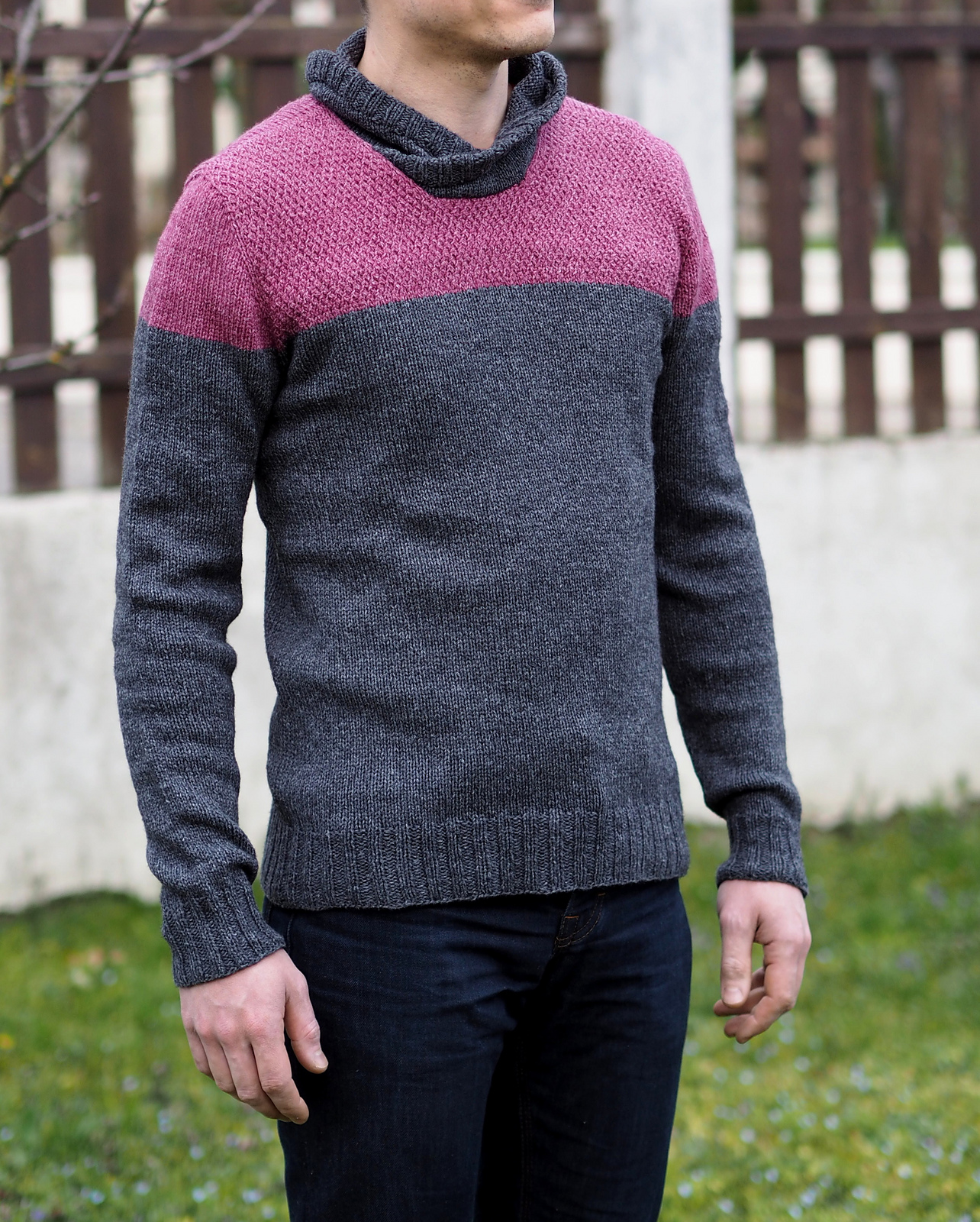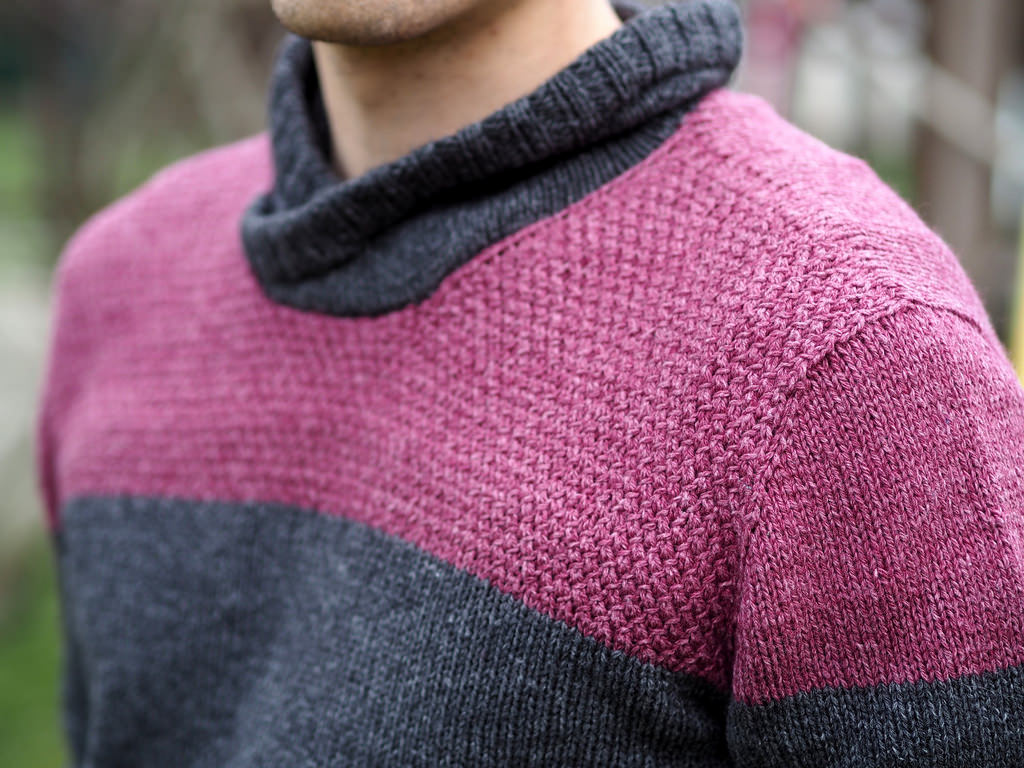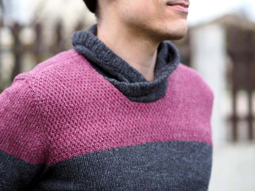 Grand Passiflore ist ein zweifarbiger Pullover mit modischem Kragen, der auch besonders bei Herren gut zur Geltung kommt. Ein besonderer Hingucker ist das texturierte Strickmuster im farbigen Schulterbereich.