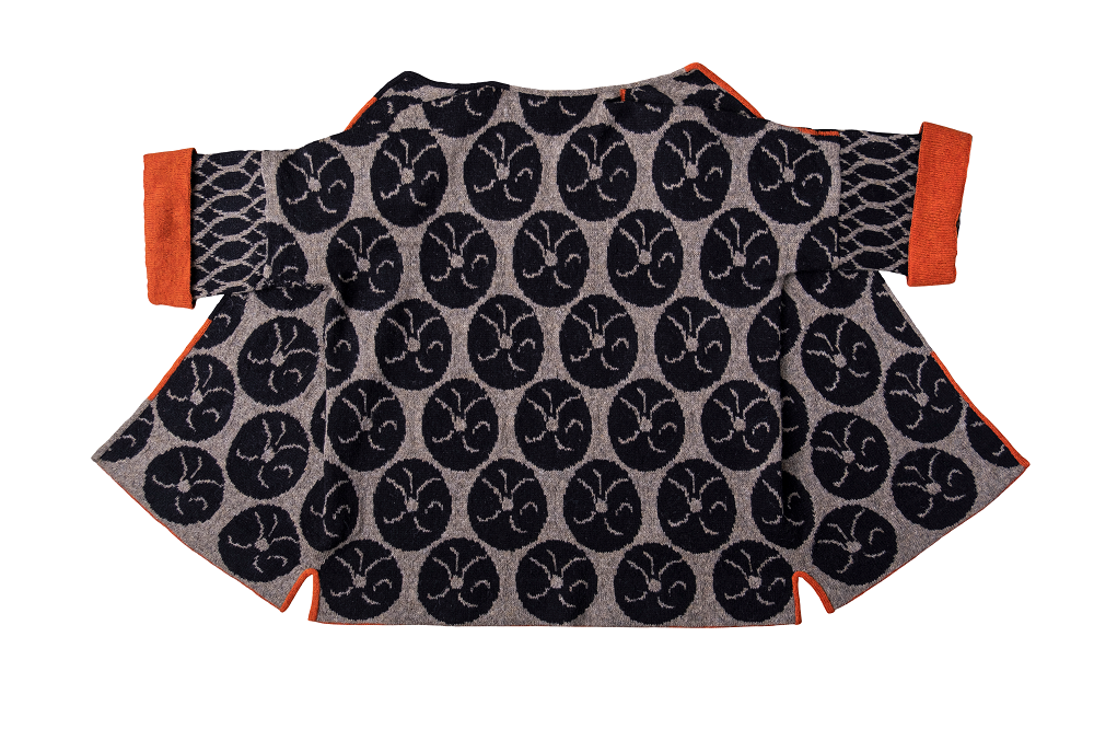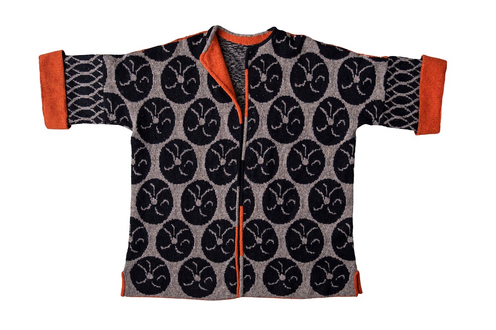 Tauche ein in die faszinierende Welt von Christel Seyfarth mit dem Aquarius Mantel – einer einzigartigen Strickjacke, inspiriert von den geheimnisvollen Quallen der Nordsee. Der Mantel besticht durch ein kunstvolles Muster in Braun-Abstufungen mit kräftigen orangen Kontrasten.