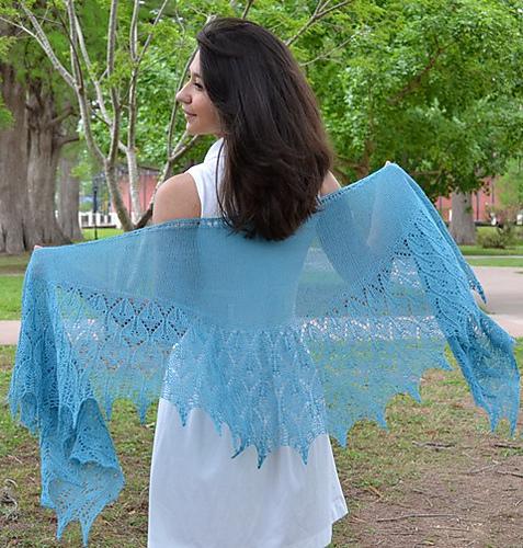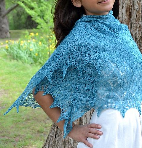 Fialka ist ein klassisches halbrundes und von unten nach oben gestricktes Design. Der Schal wird am unteren Rand begonnen und in einem Stück, beginnend mit der Lace-Kante gestrickt. Verkürzte Reihen in glatt rechts gestricktem Grund bilden dann die Form.
